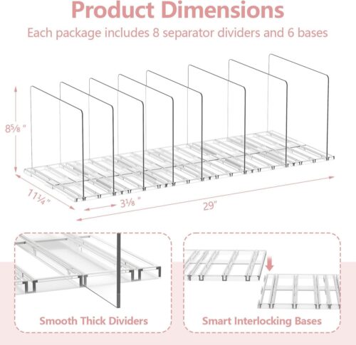 - Adjustable Dividers:Yecaye adjustable shelf dividers fit a variety of bag sizes, giving each bag its own neat and organized space for easy daily access.The removable bases can be used separately or connected, adapting seamlessly to both wide and narrow spaces