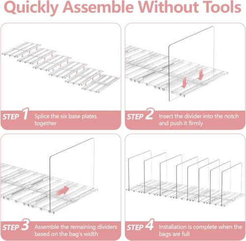 - Effortless Assembly:Set up your handbag organizer in minutes—no tools required! Simply snap the dividers into the base. Adjust or reposition the dividers anytime to perfectly fit your bags’ varying widths