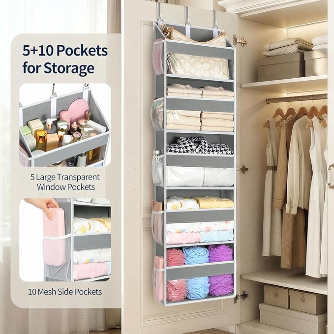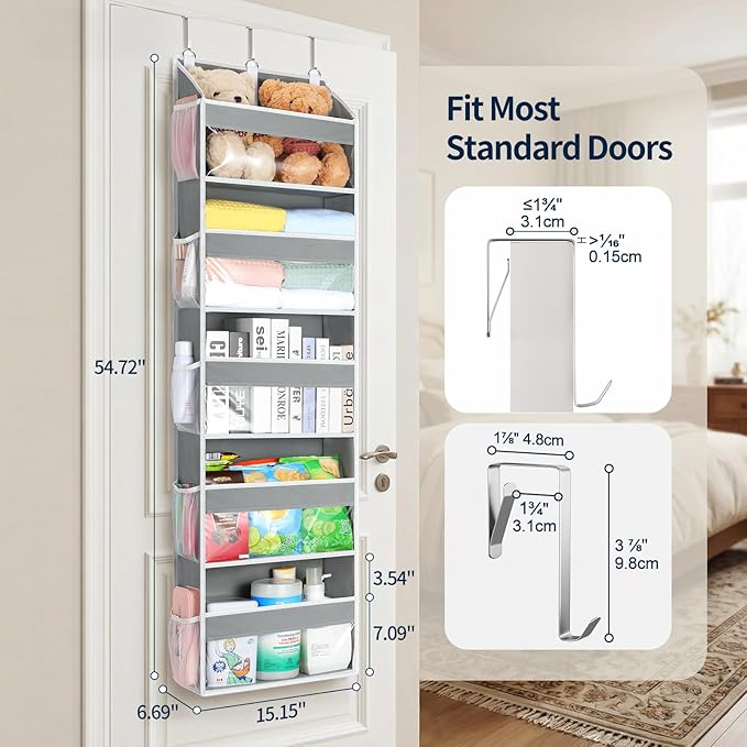 All-in-One Storage Solution: Yecaye over the door organizer measures 54.72“ x 15.15” x 6.69″, featuring 5 large independent compartments and 10 side pockets. Each compartment easily holds various types of items, while the side pockets store assorted small items. This design maximizes vertical space behind doors, offering substantial storage capacity without taking up floor space